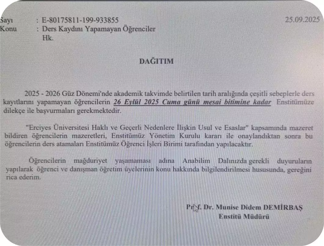 2025-2026 Güz Döneminde akademik takvimde belirtilen tarih aralığında çeşitli sebeplerle ders kaydını yapamayan lisansüstü öğrencilerimizin 26 Eylül 2025 Cuma günü mesai bitimine kadar Enstitüye dilekçe ile başvurmaları gerekmektedir.