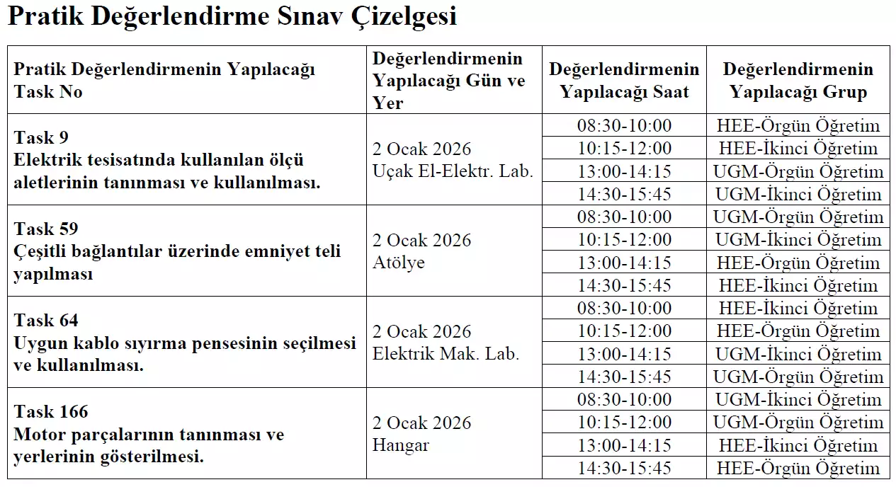 SHY-147’ye tabi 4. sınıf öğrencilerimizden, Pratik Taskları eksik olanlar için (Task 9 - 59 - 64 - 166) 2 Ocak 2026 Cuma günü B1.1 kategorisi ve B2 kategorisinde Pratik Değerlendirme Sınavı yapılacaktır.