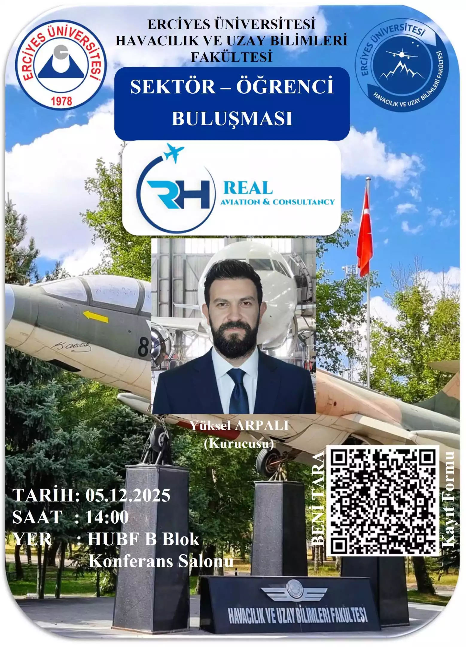 Etkinliğin konuğu, Real Aviation & Consultancy Kurucusu Yüksel Arpalı olacaktır. Havacılık alanındaki sektör tecrübelerinin aktarılacağı bu buluşmaya tüm öğrencilerimiz davetlidir.