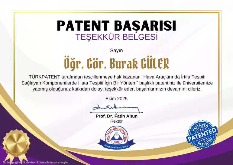 TÜRKPATENT tarafından tescillenmeye hak kazanan “Hava Araçlarında İrtifa Tespiti Sağlayan Komponentlerde Hata Tespiti İçin Bir Yöntem” başlıklı çalışma, Erciyes Üniversitesi’nin araştırma ve yenilik ekosistemine önemli bir katkı sağladı.