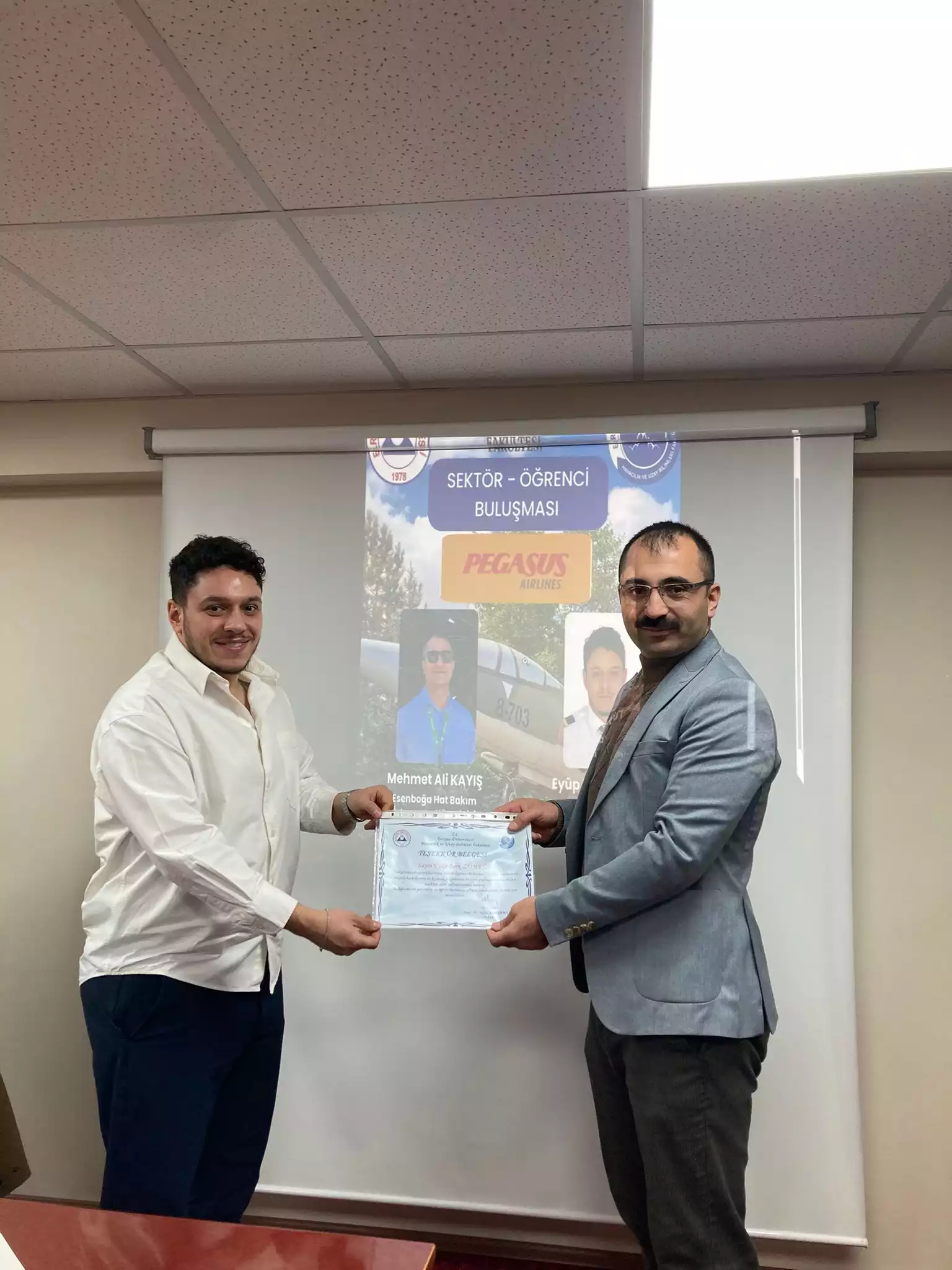 Etkinlikte, Pegasus Airlines Esenboğa Hat Bakım İstasyonu Yöneticisi Mehmet Ali Kayış ile Onaylayıcı Uçak Teknisyeni Eyüp Berk Zümrüt, öğrencilerle bir araya gelerek havacılık sektöründeki mesleki deneyimlerini paylaştı.